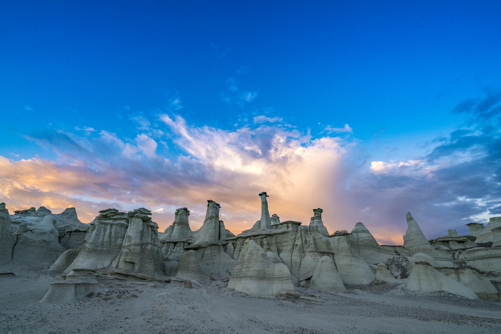 Die Bisti Badlands – wie die Region oft genannt wird – bestehen aus stark erodierten „Badlands“, einer geologischen Formation, die durch Wind und Wasser zu bizarren Formen modelliert wurde. Überall ragen diese Hoodoos aus dem Boden: dünne Felssäulen mit „Hüten“ aus härterem Gestein, die wie Skulpturen wirken.